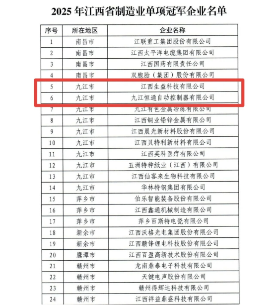 近日,省工业和信息化厅公布了2025年江西省制造业单项冠军企业名单,我院产业学院的共建企业——九江恒通自动控制器有限公司上榜。
