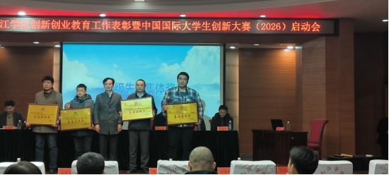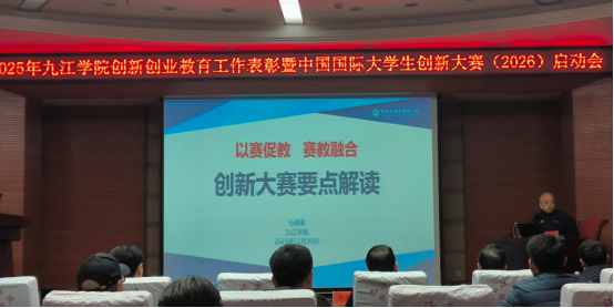 12月30日,九江学院召开2025年创新创业教育工作表彰大会暨中国国际大学生创新大赛(2026)启动会。我院高度重视、积极组织大创项目团队师生参会。凭借在2025赛事中取得的突出成绩和扎实的双创育人成效,我院荣获“先进集体奖”,副院长罗东云博士作为优秀师生代表登台发言,分享了在项目培育、团队建设与赛教融合方面的宝贵经验。