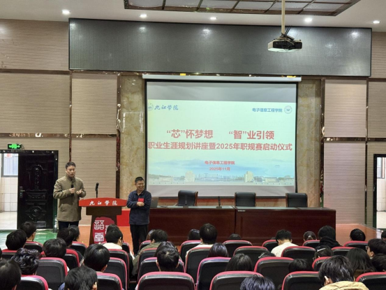 11月23日,电子信息工程学院在香远楼三楼报告厅举办职业生涯规划大赛启动仪式,并以“‘芯’怀梦想、‘智’业引领”为主题,分年级开展了三场职业规划与就业指导专题讲座。本次活动由学院党委副书记朱亚军主持,特邀优秀校友、拥有12年互联网行业经验的前端开发工程师兼职业规划师杨春主讲,标志着我院新一届职业生涯规划大赛正式拉开帷幕。